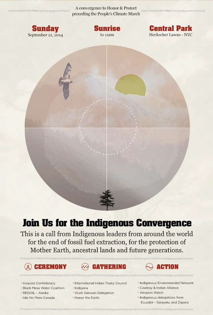 It was a healing space for the sharing of words carried from the hearts of communities afar. And as the sun rose, it was a space to presence and remind why thousands were gathered on that day. This central meeting and organizing location was a convergence of indigenous delegations both from North and South, from the Black Hills of South Dakota to the Amazon rainforest. This was not just about visibility within a location like New York City, it is about the shared vision of unity and movement building that is key to understanding our communal health as people. The convergence was held from sunrise to the commencement of the march providing a ceremonial space, as well as a central meeting, organizing, and media area for indigenous representatives and support organizations.
